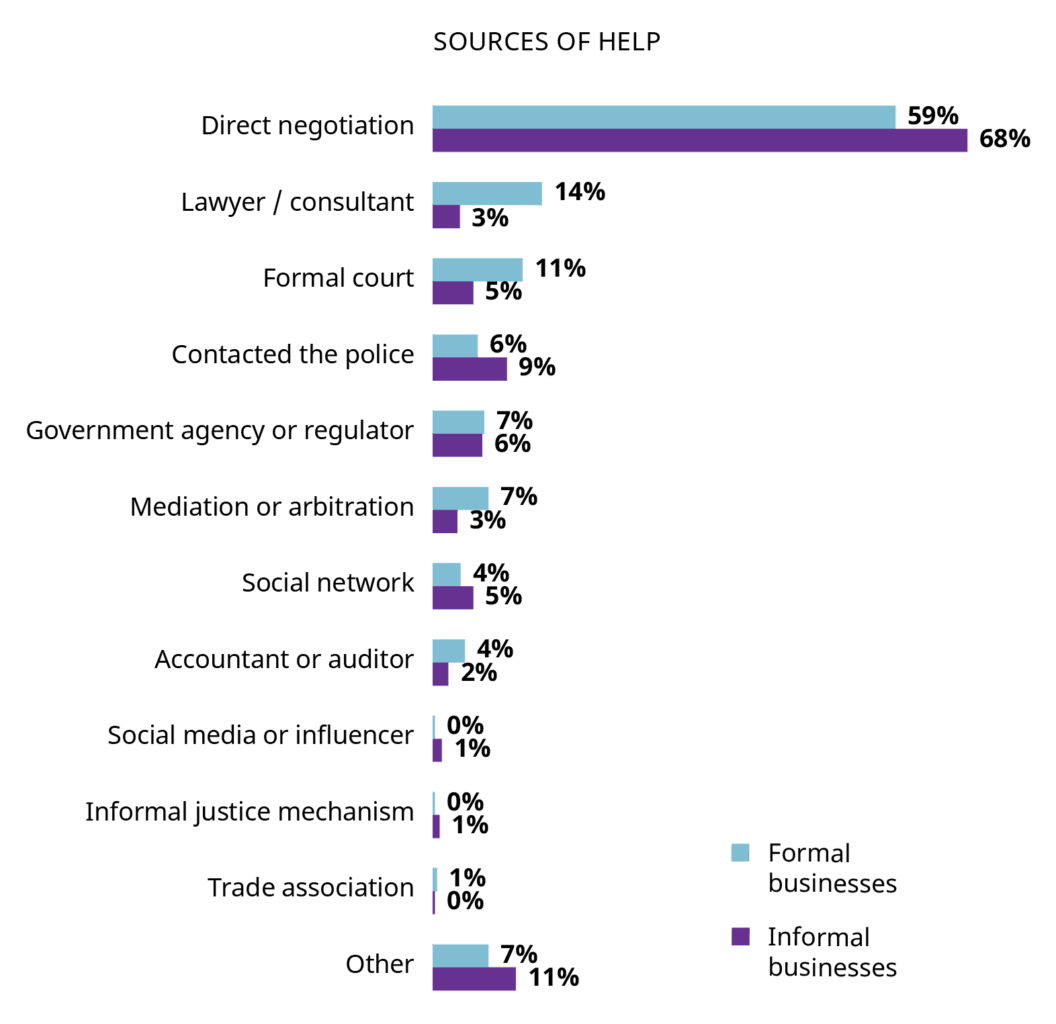 While the challenges are significant, MSMEs still prefer to manage problems through direct negotiation. This is the first choice for fifty nine percent of formal firms and sixty eight percent of informal firms that take action. Awareness of support services is very low. Only sixteen percent of formal firms and eight percent of informal firms know these services exist. Actual use is even lower, with nine percent of formal firms and two percent of informal firms using any form of legal support in the past two years. Many informal owners avoid courts entirely because they believe their status prevents access. When people do seek help, lawyers tend to be the most useful source, while satisfaction with police and government agencies is much lower.