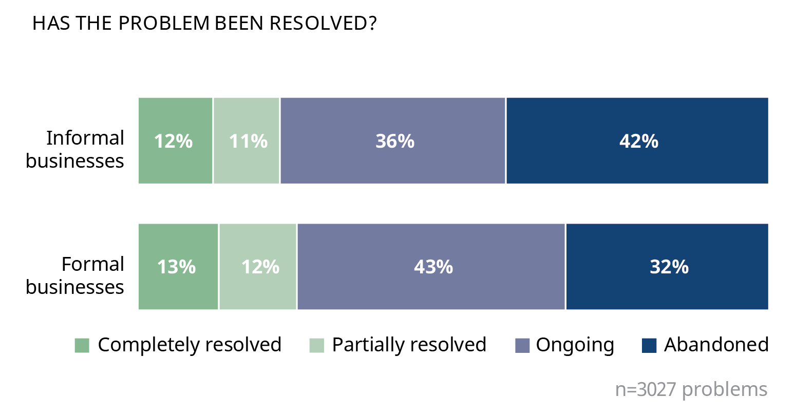 Perhaps the most urgent finding is the extremely low resolution rate across the sector. Around eighty percent of all legal problems are either still ongoing or have been abandoned. Only one in five is considered resolved even partially. Many businesses simply step back from their most serious problems, especially informal firms. Formal firms are slightly more likely to keep problems open without closure. Even when a case does reach an outcome, many owners say the result did not feel fair. The reasons behind this are widespread and persistent.